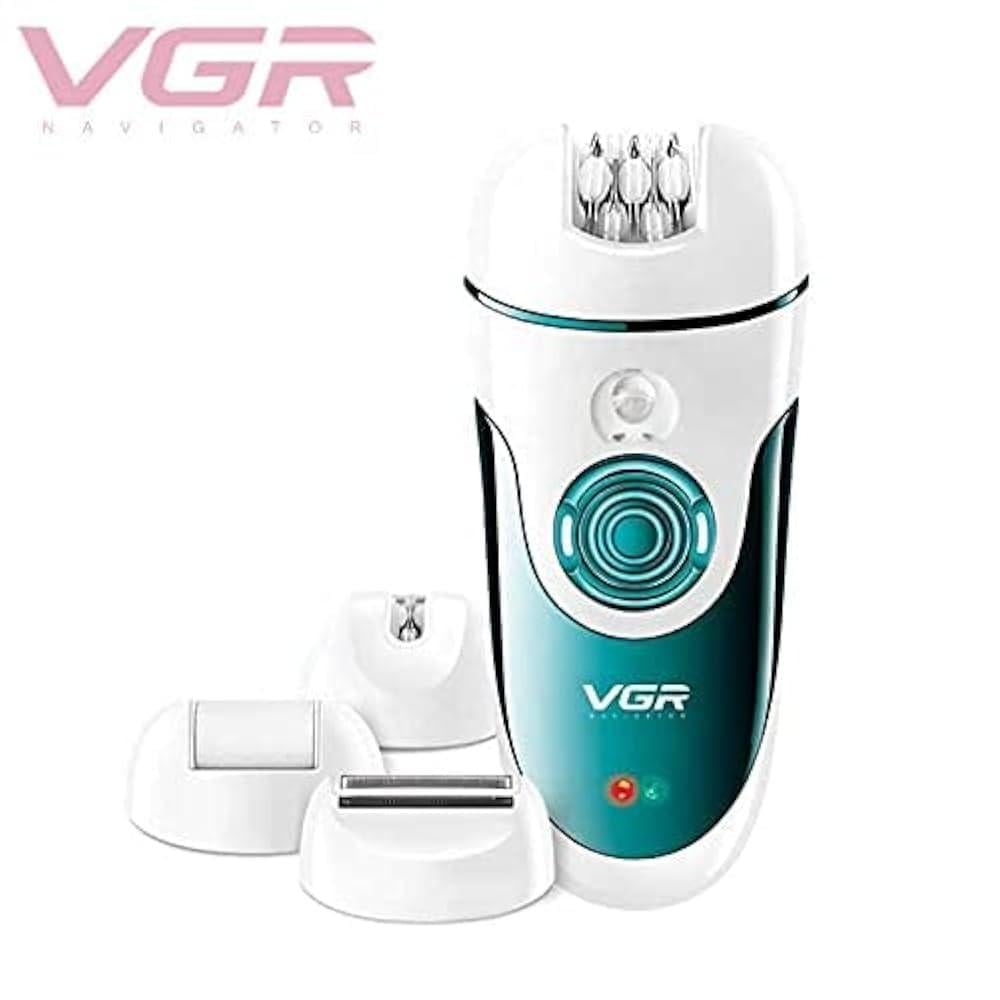 • ماكينة إزالة الشعر للسيدات من ماركة VGR مميزة بأربعة رؤوس مختلفة تناسب جميع الاحتياجات الخاصة بالإزالة. تتضمن هذه الرؤوس رأسًا لإزالة الشعر من جميع مناطق الجسم، ورأسًا لإزالة الشعر من المناطق الحساسة، ورأسًا بشفرة للتنعيم، ورأسًا سنفرة.